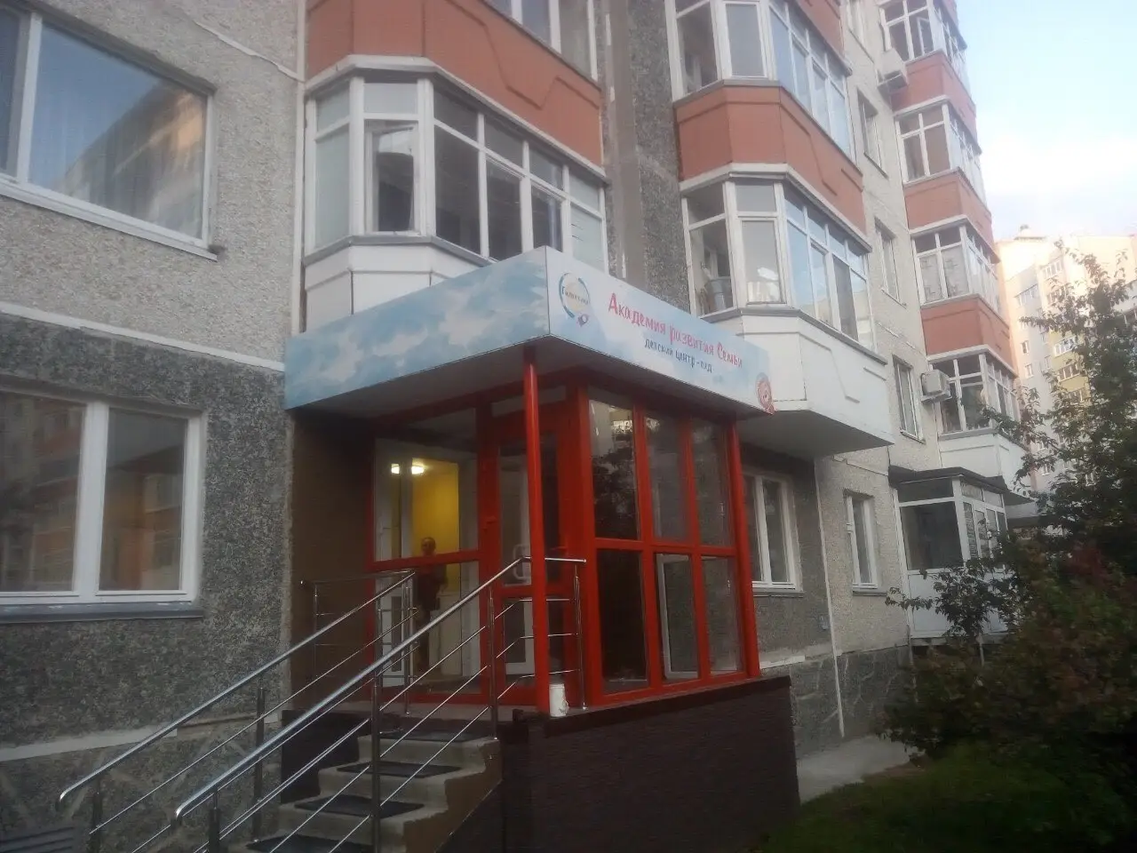 С одной стороны фриз обшит плоскими композитными панелями оклееными пленкой с печатью, с другой стороны на входе установлен объемный световой короб с инкрустацией.