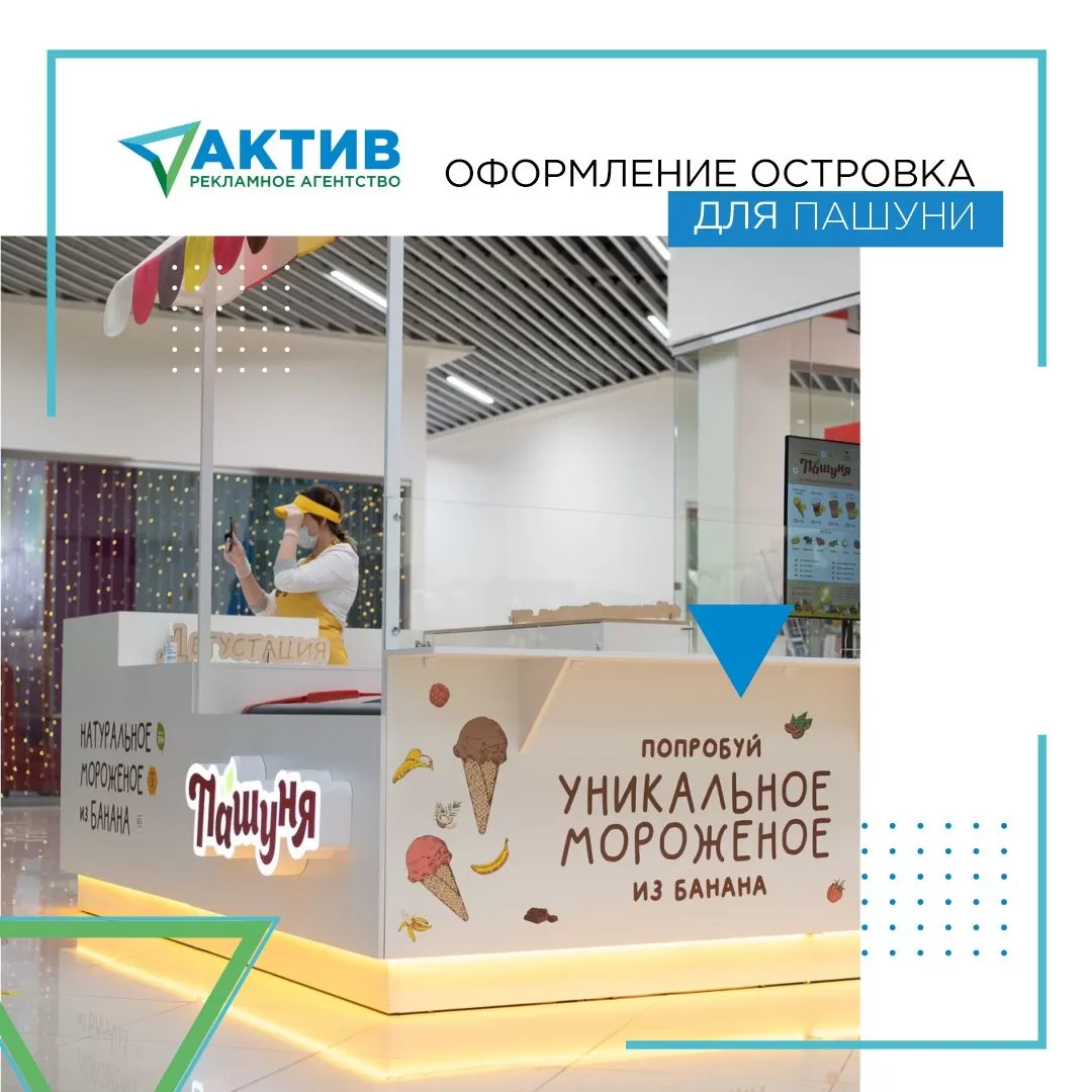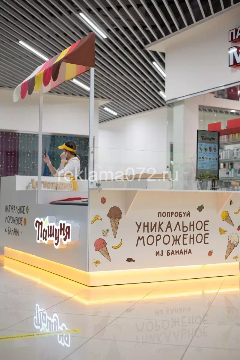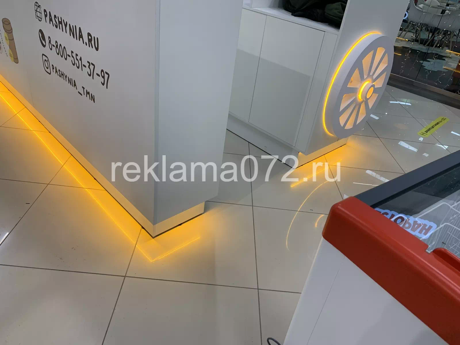 На фасаде конструкции разместились наклейки с полноцветной печатью и плоттерной резкой, фигурный световой короб, и декоративное световое колесо.